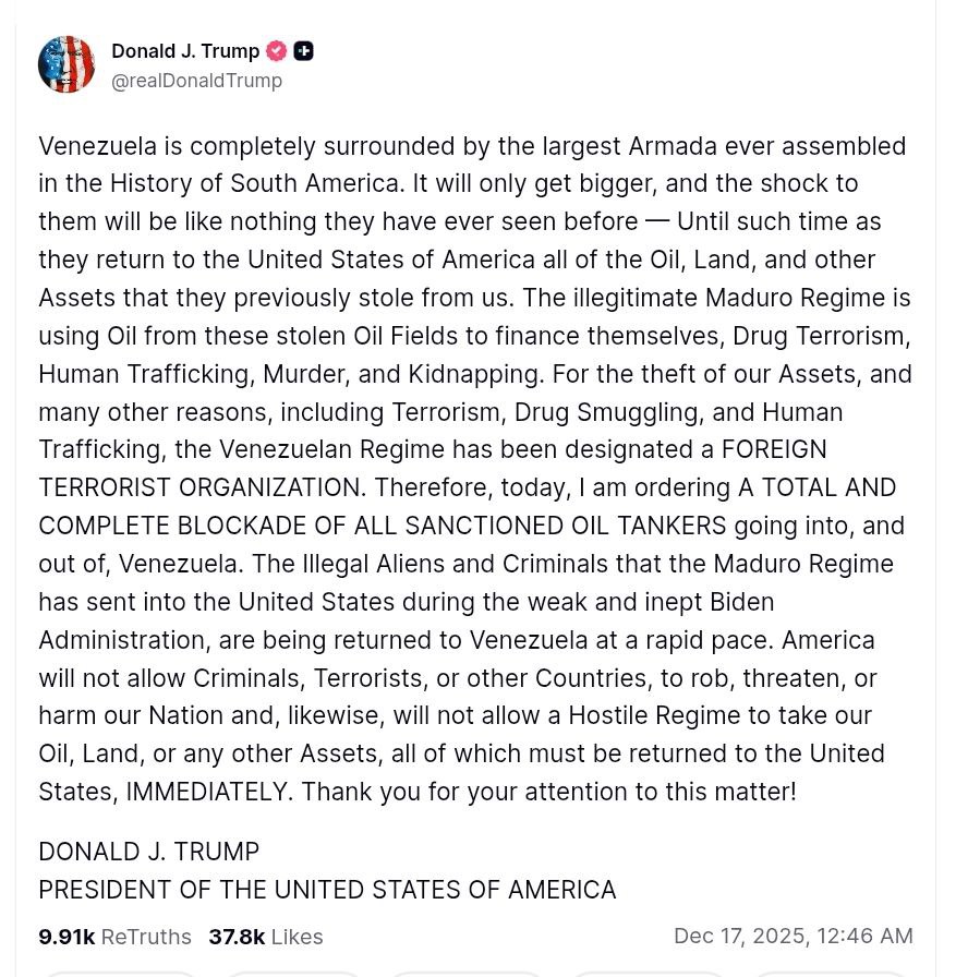 Президент США повідомив, що наказав про "повну і повну блокаду всіх нафтових танкерів, що входять до Венесуели і виходять з неї".