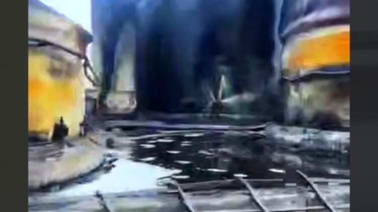 На відео стоянка з масловозами покрилася шаром продукту кілька сантиметрів. Можна помітити, що струмені олії б'ють із ушкоджених уламками цистерен.