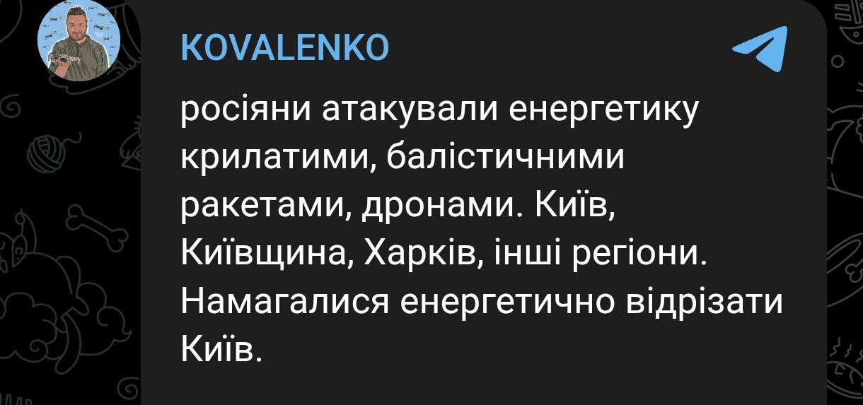 За даними Андрія Коваленка, Київ та область, а також Харків атакували дронами, крилатими та балістичними ракетами.