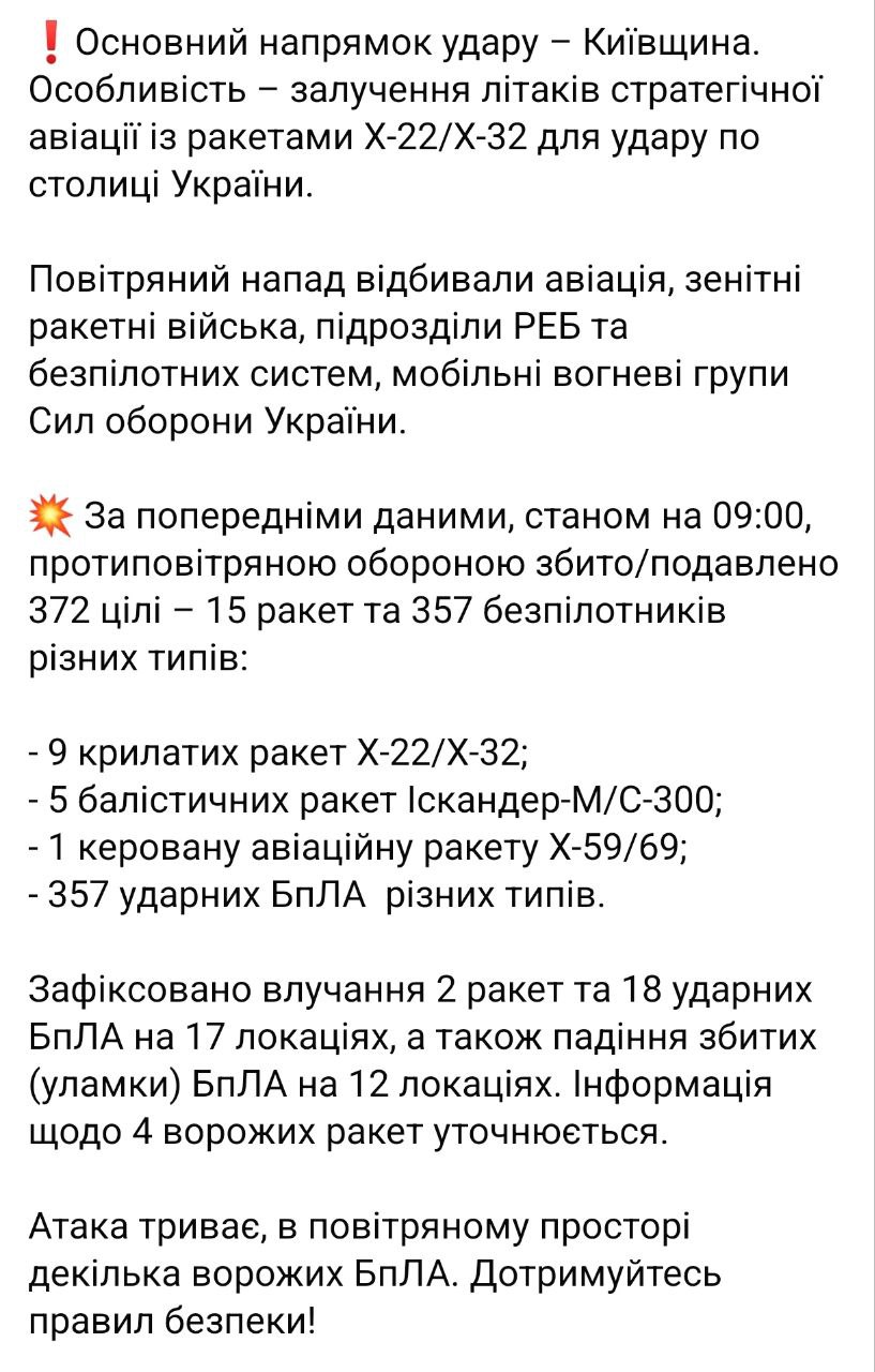 За даними військових, було завдано комбінованого удару. Зафіксовано 396 ракет і дронів, у тому числі - дві протикорабельні ракети "Циркон" (даних про збиття немає), дванадцять крилатих ракет Х-22/Х-32 (збито 9), шість балістичних ракет Іскандер-М/С-300 (збито 5), одну керовану авіаційну 375 ударних безпілотників (збито 357).