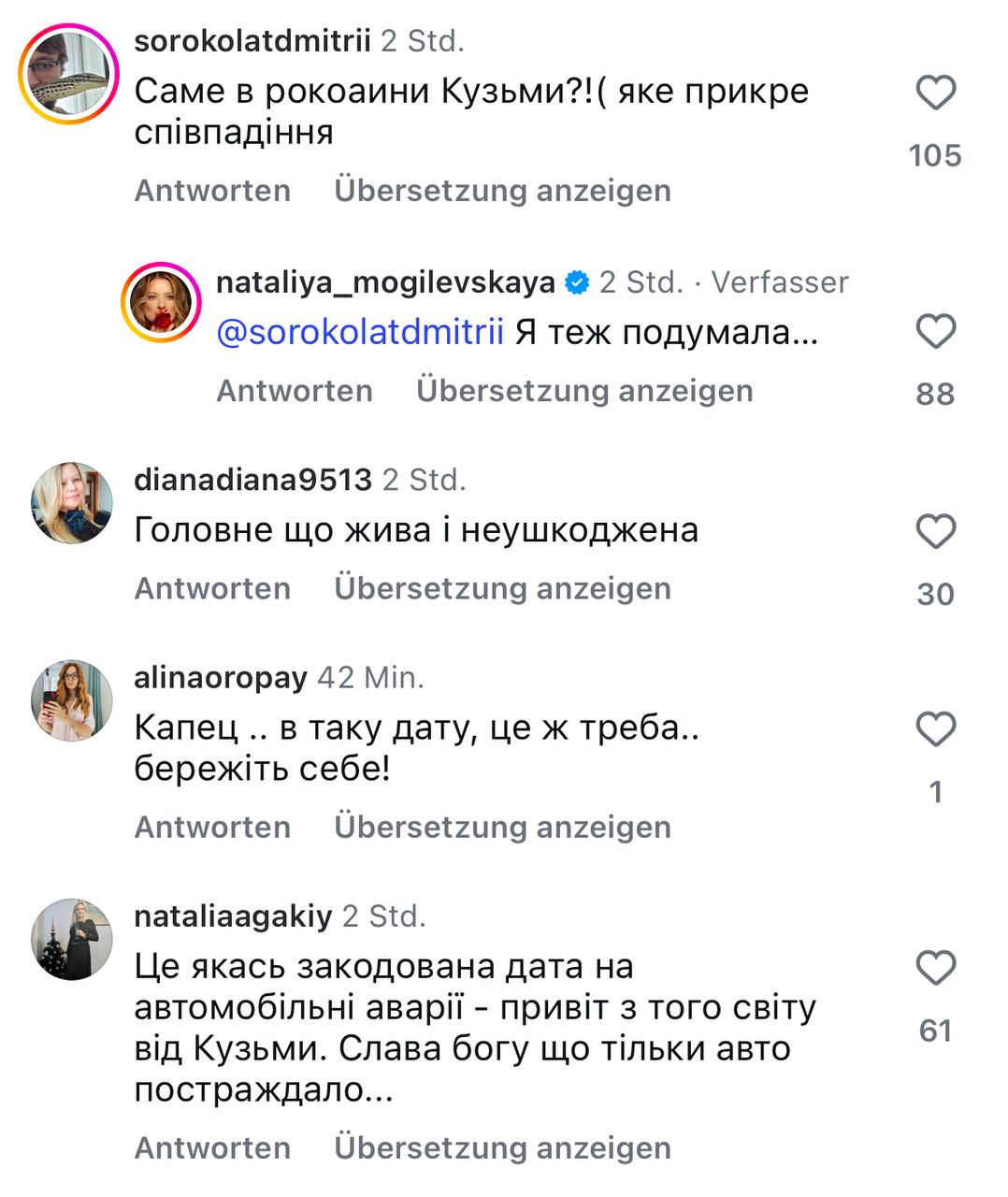 Водночас передплатники Могилевської у коментарях під постом звернули увагу, що подія сталася того ж дня, коли в аварії 11 років тому загинув український співак Андрій Кузьменко (Кузьма Скрябін).